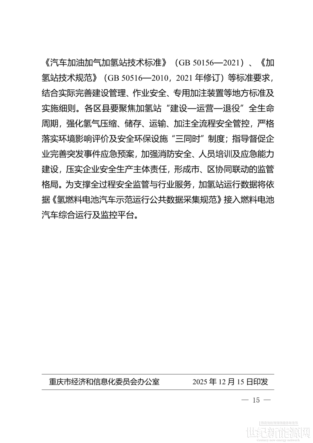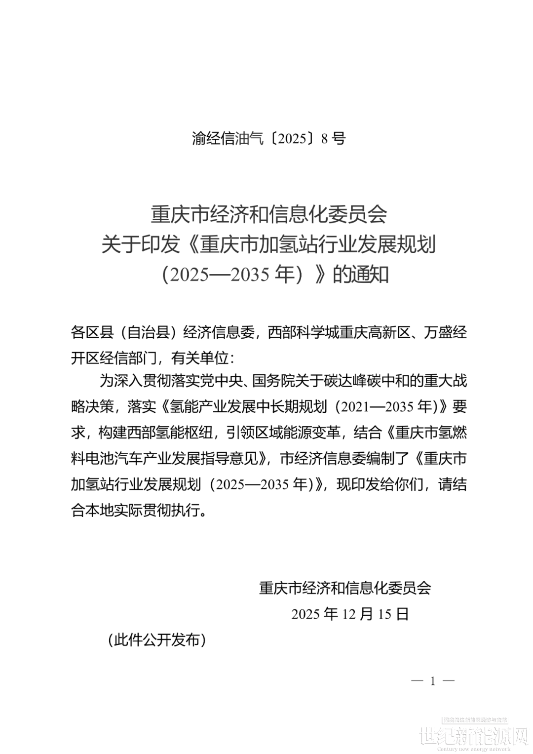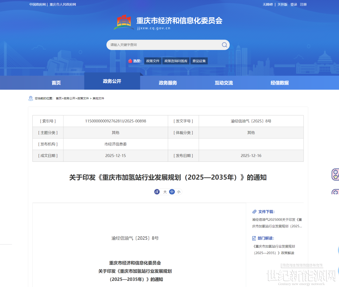 12月16日,重庆市经信委印发《重庆市加氢站行业发展规划(2025—2035年)》的通知。