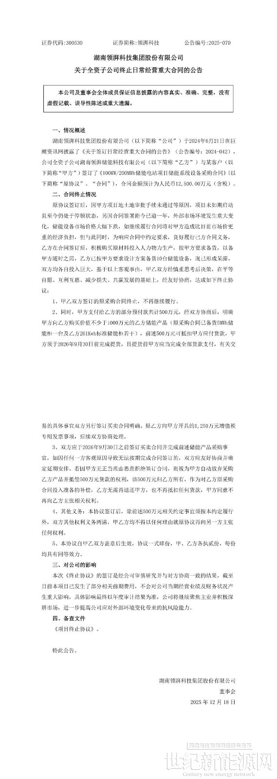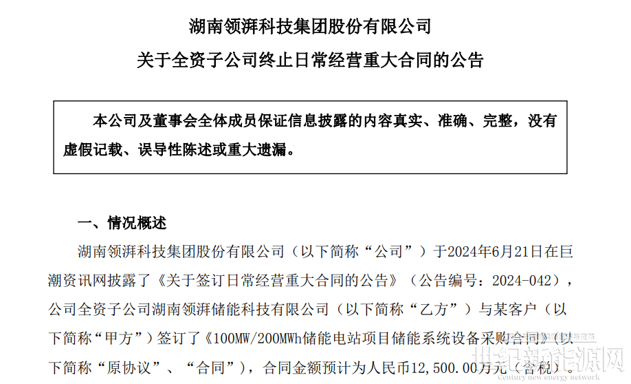 12月17日晚间,领湃科技发布《关于全资子公司终止日常经营重大合同的公告》,公司全资子公司湖南领湃储能科技有限公司与某客户签订的《100MW/200MWh储能电站项目储能系统设备采购合同》已终止,原合同金额预计为1.25亿元(含税)。