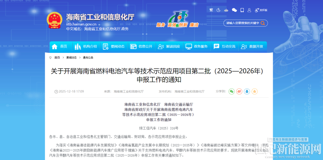 12月15日,海南省工业和信息化厅、海南省交通运输厅、海南省财政厅发布《关于开展海南省燃料电池汽车等技术示范应用项目第二批(2025—2026年)申报工作的通知》。