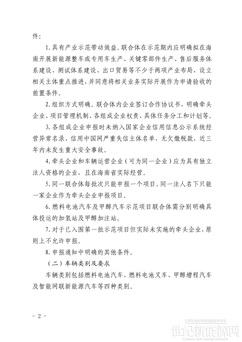 为落实《海南省清洁能源汽车发展规划》《海南省氢能产业发展中长期规划(2023—2035年)》《海南省碳达峰实施方案》等文件精神,根据《海南省2023—2025年鼓励新能源汽车推广应用若干措施》关于支持燃料电池汽车、甲醇汽车等新技术示范应用的要求,现就开展海南省燃料电池汽车及甲醇汽车等技术示范应用项目第二批(2025—2026年)申报工作有关事项通知如下: