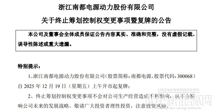 12月18日晚间,南都电源宣布终止筹划控制权变更事项。