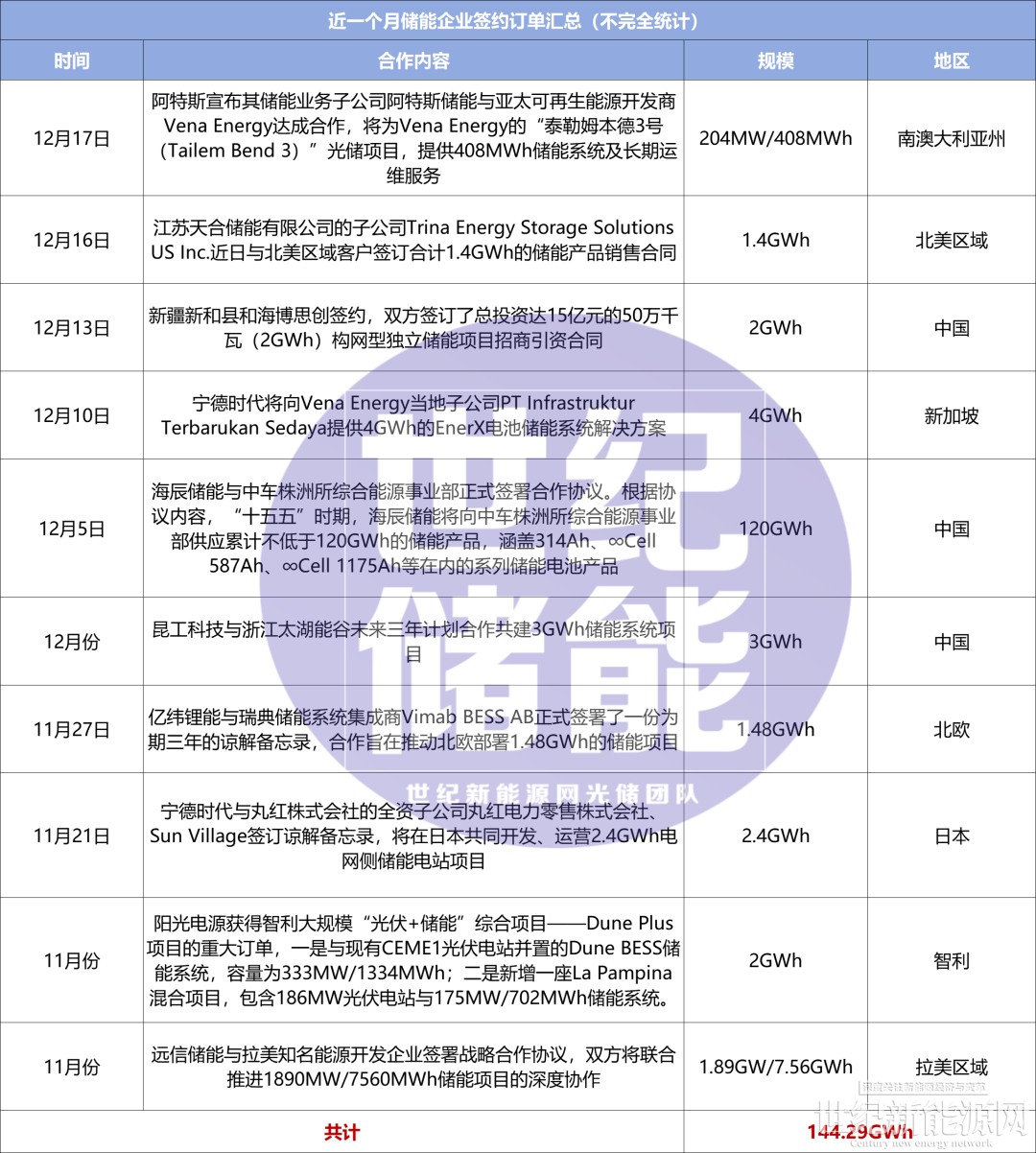 近一个月,中国企业在全球储能领域的签约势头较为强劲。根据世纪储能不完全统计,近期有超10家中国储能企业获得订单,签约总规模超144GWh,其中海辰储能与中车株洲所签约规模最大、时间最长,其次是远信储能与拉美知名能源开发企业的订单。