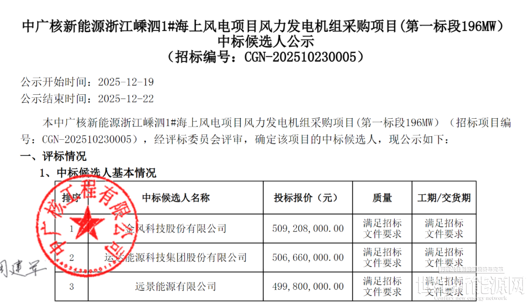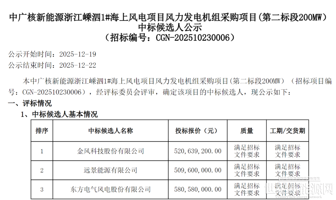 12月19日,中广核新能源浙江嵊泗1# 海上风电项目风力发电机组采购项目中标候选人公示,规模共计396MW,金风科技预中标,投标总价10.3亿元。