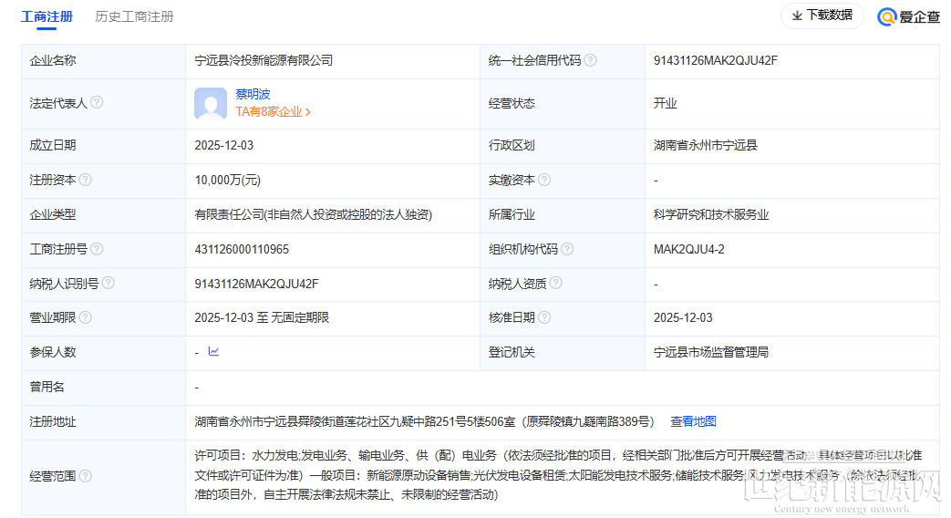 近日,宁远县泠投新能源有限公司成立,注册资金1亿元人民币。