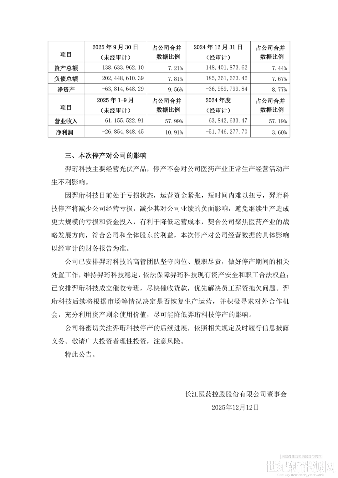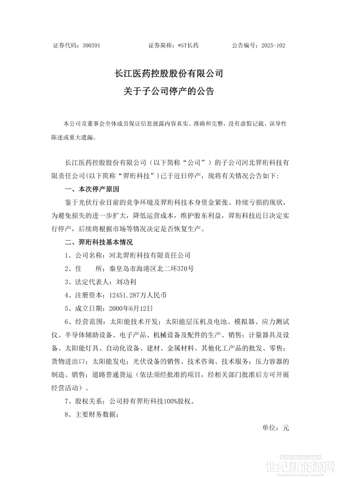 关于停产的原因,*ST长药表示,鉴于光伏行业目前的竞争环境及羿珩科技本身资金紧张、持续亏损的现状,为避免损失的进一步扩大,降低运营成本,维护股东利益,羿珩科技近日决定实行停产,后续将根据市场等情况决定是否恢复生产。
