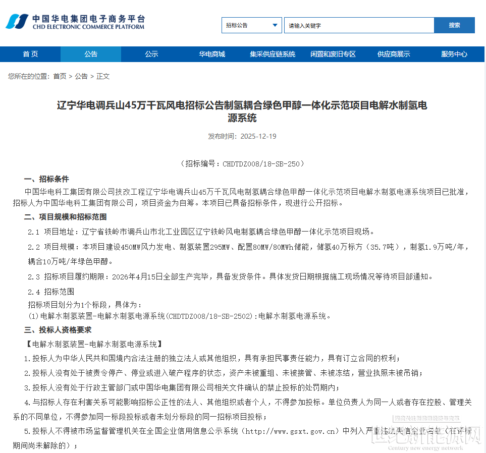 12月19日,中国华电集团电子商务平台发布辽宁华电调兵山45万千瓦风电招标公告制氢耦合绿色甲醇一体化示范项目电解水制氢电源系统招标。