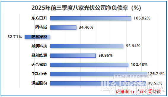 2025年前三季度,有不少企业的净负债率暂时超过100%。而隆基绿能由于货币资金高达513.66亿元,成为八家企业中唯一一家净负债率为负数的企业。