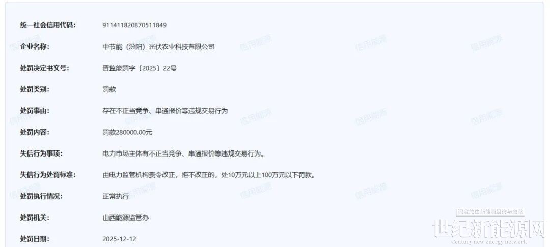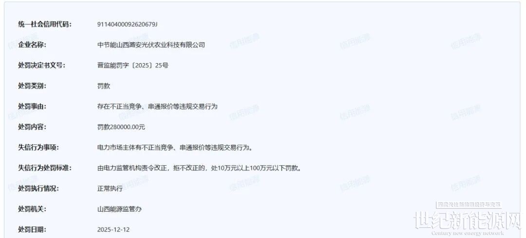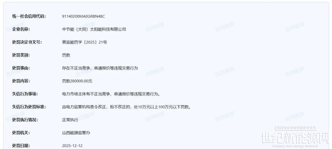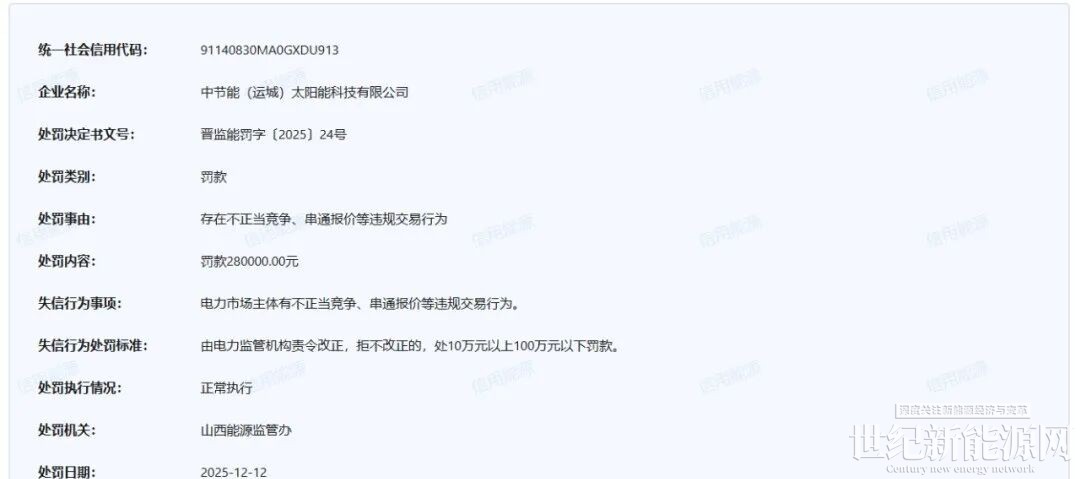 近日,信用能源网站公示山西能源监管办行政处罚决定,6家发电企业因不正当竞争、串通报价等违规交易行为,合计被罚186万元;其中,中节能旗下涉及的光伏项目公司5家,每个企业罚款28万元。
