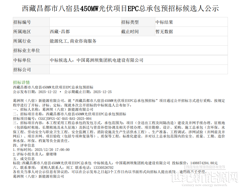 12月22日,西藏昌都市八宿县450MW(519.359MWp)光伏项目EPC总承包预招标中标候选人公示: