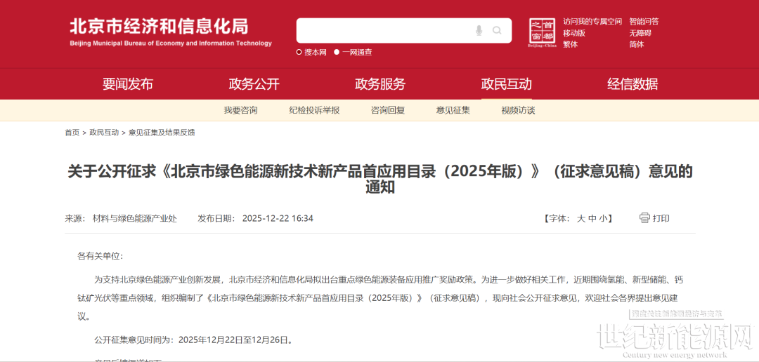 为支持北京绿色能源产业创新发展,北京市经济和信息化局拟出台重点绿色能源装备应用推广奖励政策。为进一步做好相关工作,近期围绕氢能、新型储能、钙钛矿光伏等重点领域,组织编制了《北京市绿色能源新技术新产品首应用目录(2025年版)》(征求意见稿),现向社会公开征求意见,欢迎社会各界提出意见建议。