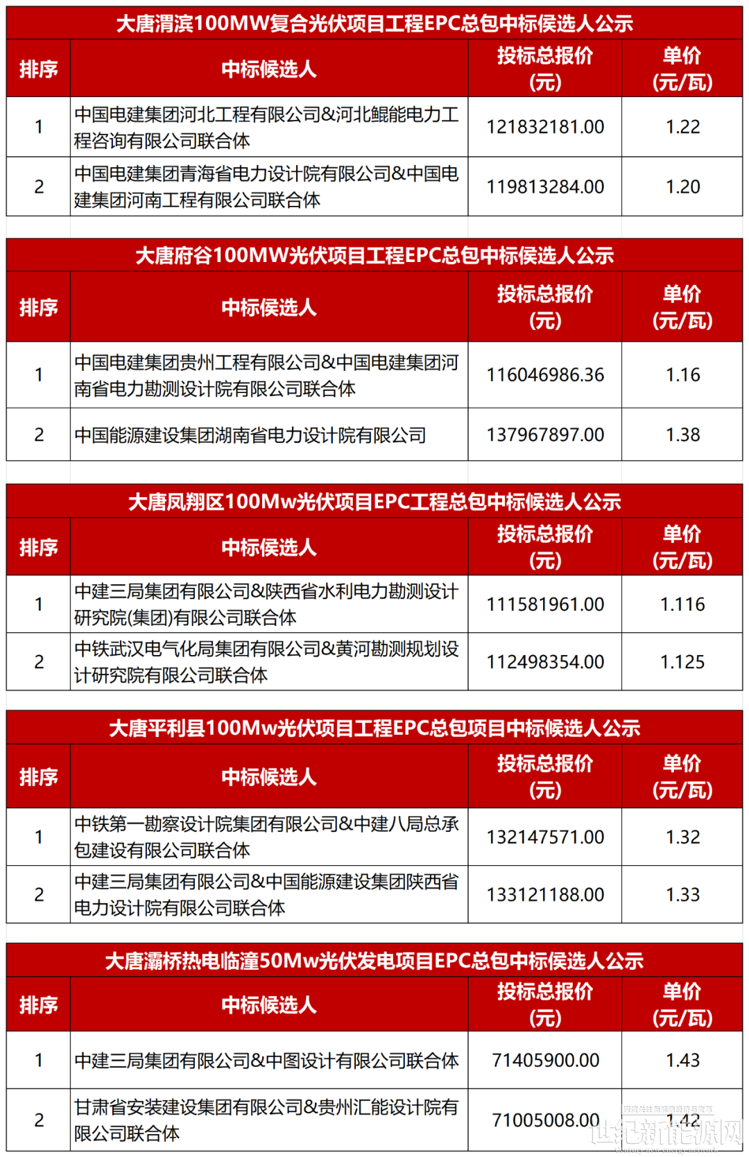 大唐灞桥热电临潼50MW光伏发电项目,中建三局集团有限公司&中图设计有限公司联合体以1.43元/瓦位列第一候选人。