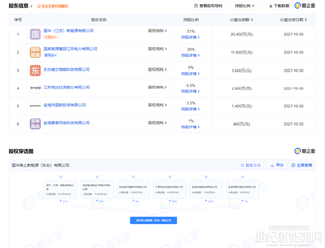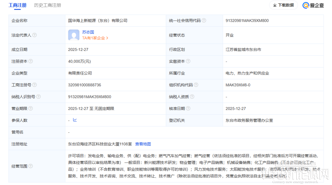 12月27日,国华海上新能源(东台)有限公司成立,注册资金4亿元人民币。