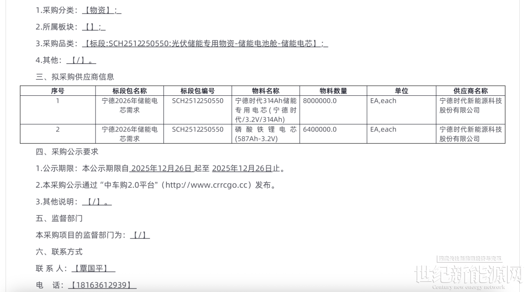 12月26日,宁德2026年储能电芯需求直接采购公示。