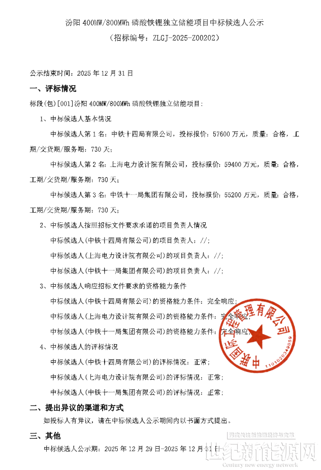 12月29日,汾阳400MW/800MWh磷酸铁锂独立储能项目中标候选人公示。