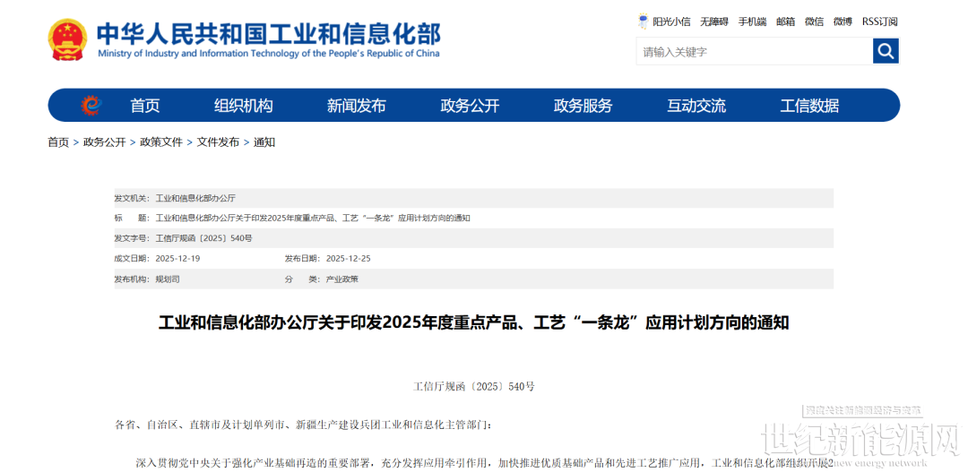 12月25日,工信部发布了《2025年度重点产品、工艺“一条龙”应用计划方向的通知》(以下简称《通知》)。
