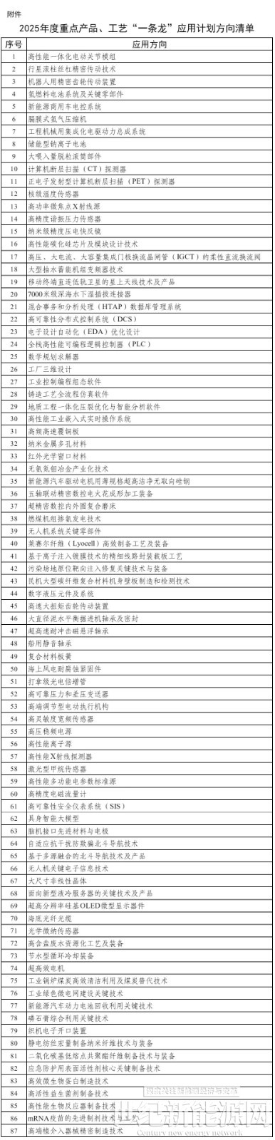 根据《通知》,共87个重点产品和工艺入选了“一条龙”应用计划方向(具体见附表)。而此前在9月17日,工信部规划司曾发布了《征集2025年度重点产品、工艺“一条龙”应用计划推进机构的通知》(以下简称《征集通知》),提出的目标是116个重点方向。