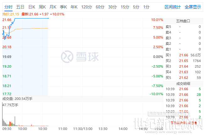 12月29日,9点49分金风科技(002202)触及涨停板,涨幅10.01%,涨停价为21.66元。泰胜风能涨超8%,双一科技、振江股份、明阳智能、大金重工跟涨。