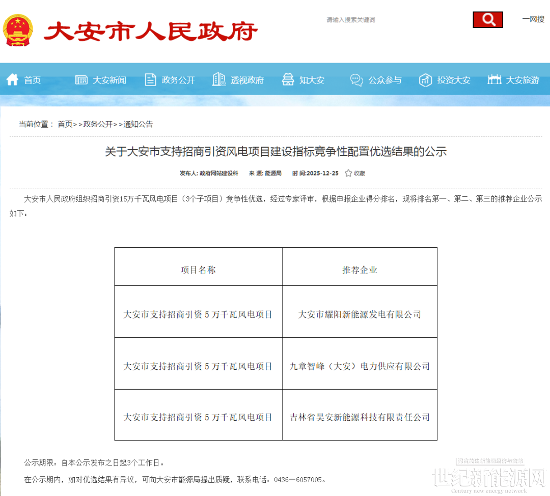12月25日,吉林大安市人民政府发布《关于大安市支持招商引资风电项目建设指标竞争性配置优选结果的公示》。