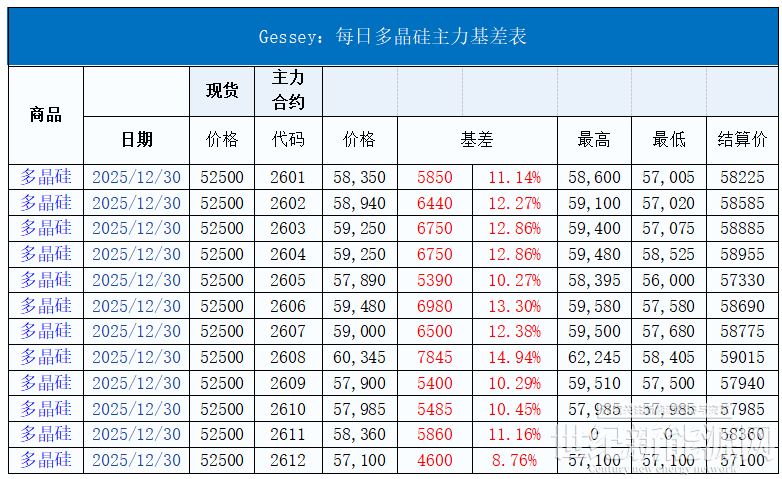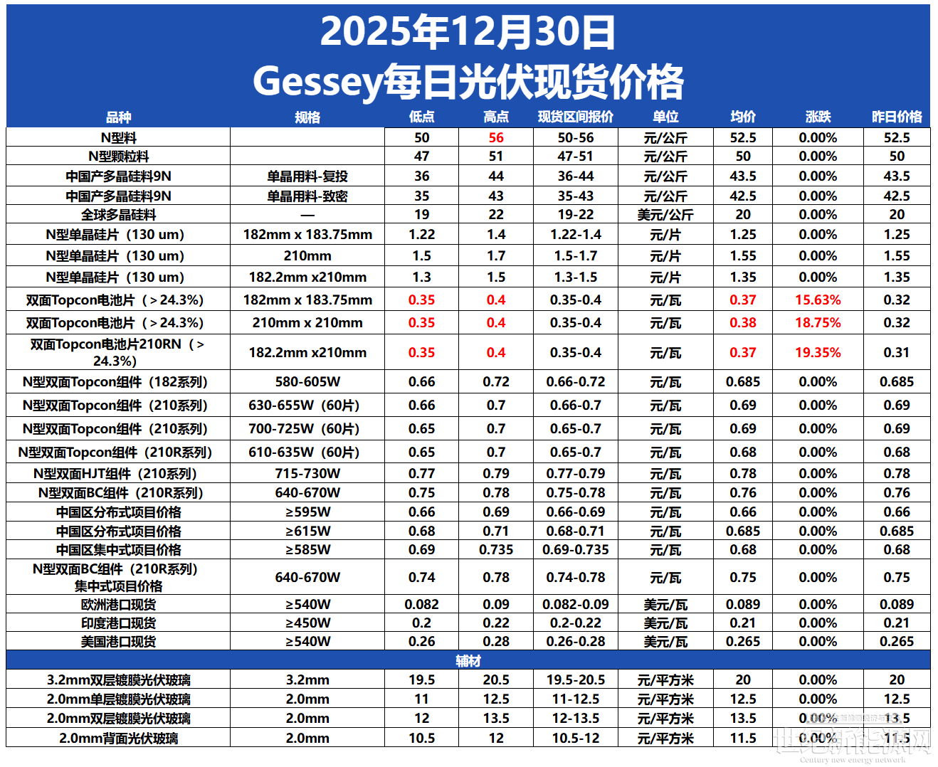 今日硅料价格整体维稳,N型料主流价格在50-56元/公斤,均价52.5元/公斤。N型颗粒硅主流价格在47-51元/公斤,均价50元/公斤。国产复投特级硅料主流价格在36-44元/公斤,均价43.5元/公斤,国产致密特级硅料主流价格在35-43元/公斤,均价42.5元/公斤。全球多晶硅料主流价格在19-22元/公斤,均价20元/公斤。