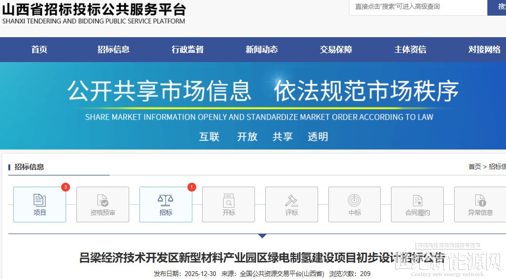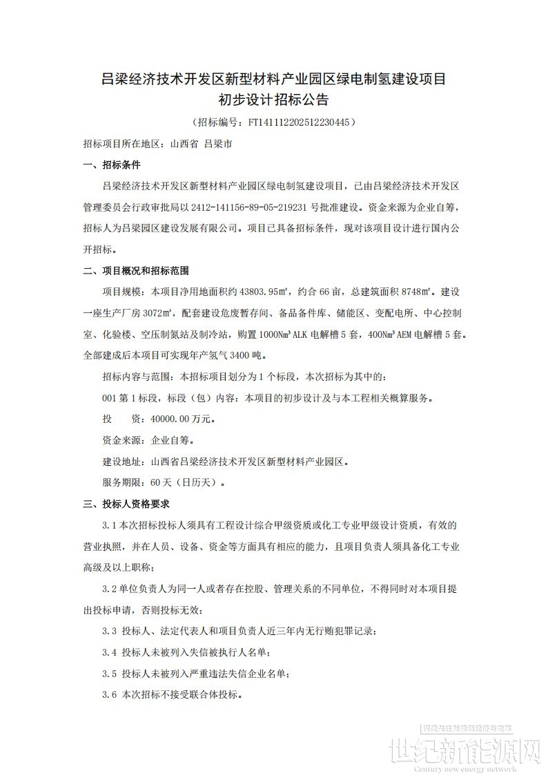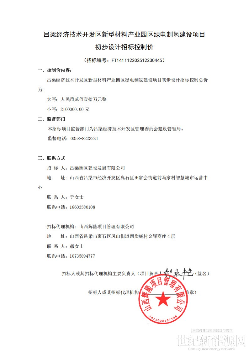 12月30日,吕梁经济技术开发区新型材料产业园区绿电制氢建设项目初步设计招标公告,及初步设计招标控制价公告。