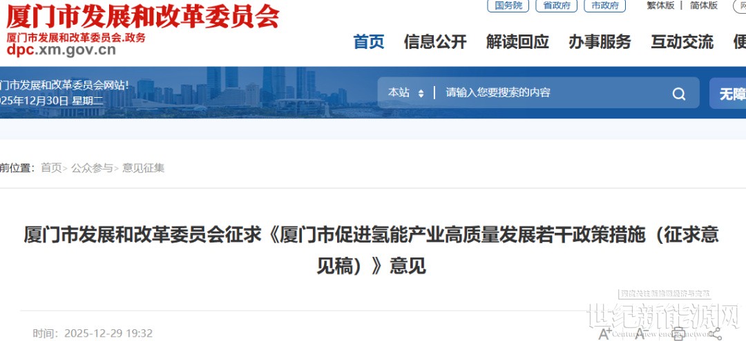 12月29日,厦门市发展和改革委员会征求《厦门市促进氢能产业高质量发展若干政策措施(征求意见稿)》意见。