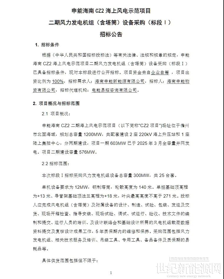 根据招标公告,申能海南CZ2二期海上风电示范项目场址位于儋州市北面海域,规划总容量1200MW,共配套建设2座220kV海上升压站和1座陆上集控中心,分两期建设,项目一期603MW已于2025年3月全容量并网发电。项目二期建设容量576MW。