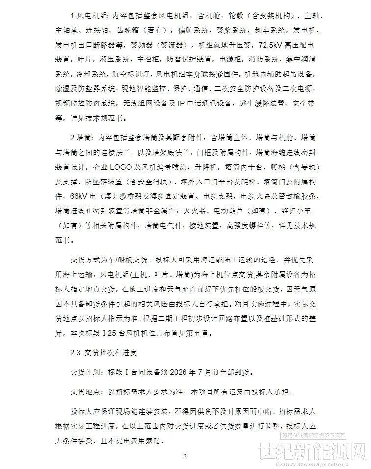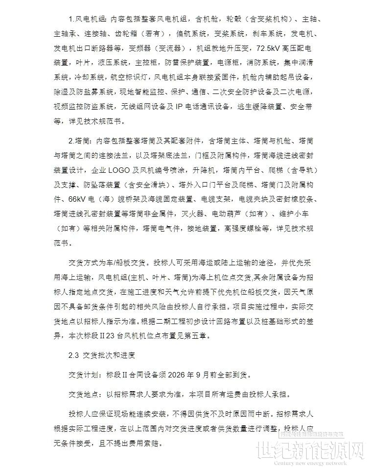 标段II:招标采购风力发电机组设备总容量276MW,共23台套。单机设备要求为12MW,钢制塔筒,轮毂高度为140米。单桩基础顶高程为+13米、导管架基础顶法兰高程为+18米,叶尖最高高度不高于 271米。交货计划:标段II合同设备须 2026年9月前全部到货。