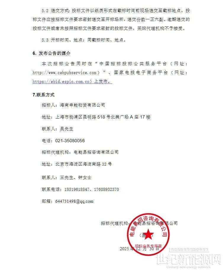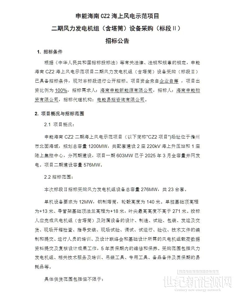 12月30日,申能海南CZ2海上风电示范项目二期风力发电机组(含塔筒)设备采购(标段I、标段II)招标公告发布,规模合计576MW。