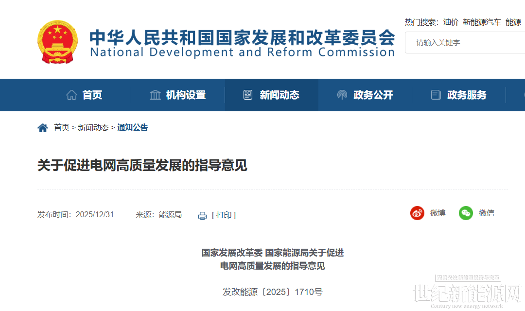 12月31日,国家发展改革委 国家能源局发布《关于促进电网高质量发展的指导意见》。