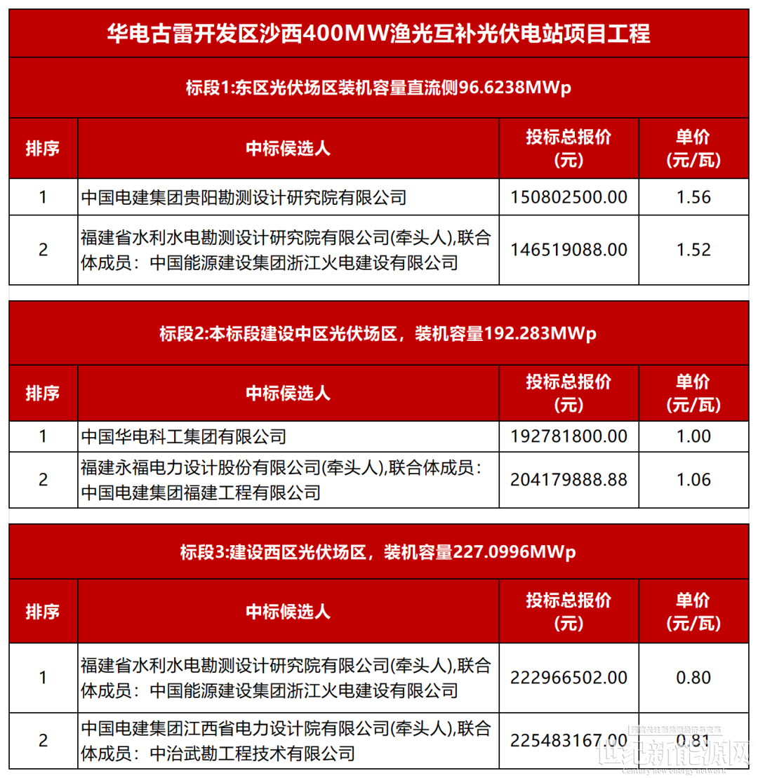 标段3:西区光伏场区,装机容量227.0996MWp(交流侧177MW),福建省水利水电勘测设计研究院有限公司(牵头人),联合体成员:中国能源建设集团浙江火电建设有限公司以0.8元/W位列第一候选人。