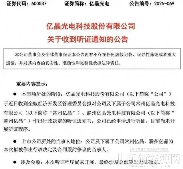 2025年12月28日,亿晶光电发布公告称,公司于近日收到全椒经济开发区管理委员会拟对公司及下属子公司常州亿晶光电科技有限公司(以下简称“常州亿晶”)、滁州亿晶光电科技有限公司(以下简称“滁州亿晶”)作出行政决定的听证通知书,拟解除投资协议、追回1.4亿元出资款,并追究公司代建费用、租金等相关违约责任。
