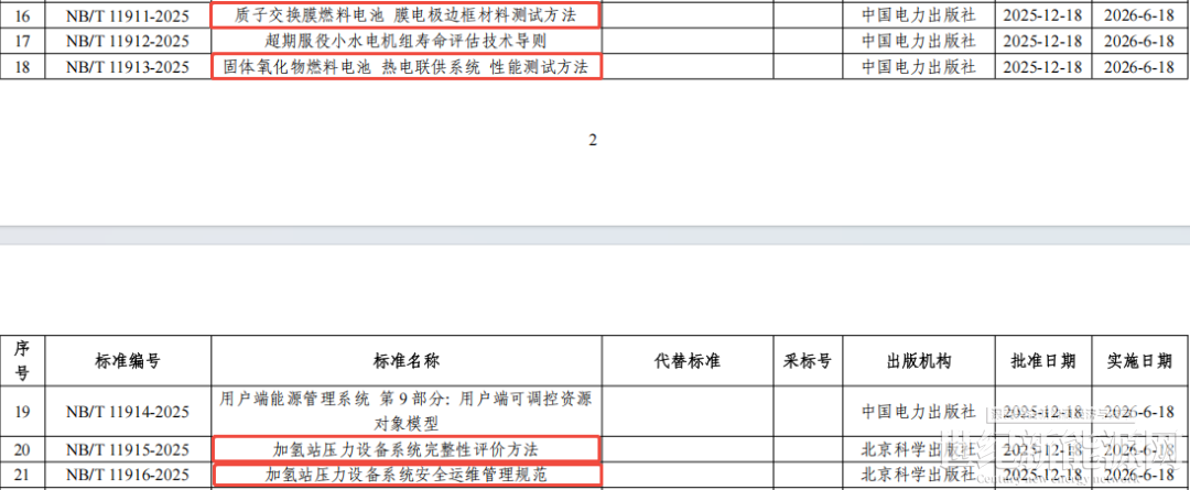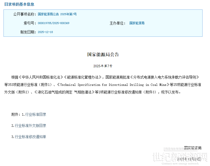 12月30日,国家能源局发布2025年第7号公告,国家能源局批准《分布式电源接入电力系统承载力评估导则》等353项能源行业标准、《Technical Specification for Directional Drilling in Coal Mine》等25项能源行业标准外文版、《液化石油气组成的测定 气相色谱法》等2项能源行业标准修改通知单,现予以发布。其中氢能相关包括:质子交换膜燃料电池 膜电极边框材料测试方法、固体氧化物燃料电池 热电联供系统 性能测试方法、加氢站压力设备系统完整性评价方法、加氧站压力设备系统安全运维管理规范、清洁低碳氢评价标准、绿色合成氨、绿色甲醇。