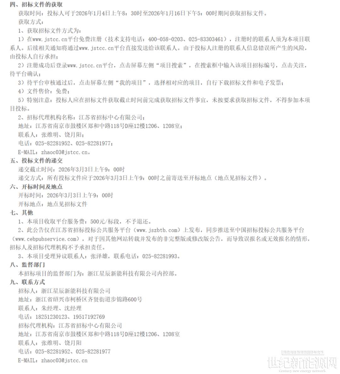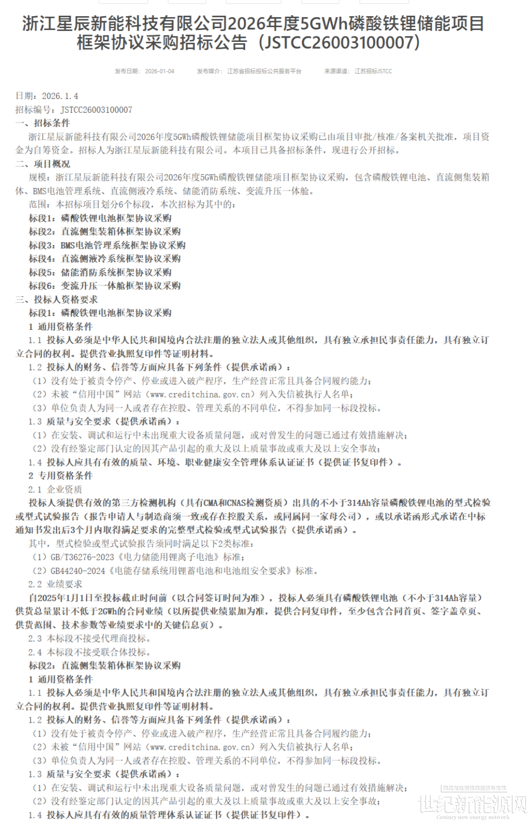 1月4日,浙江星辰新能科技有限公司5GWh磷酸铁锂储能项目框架协议采购、800MWh全钒液流电池储能项目框架协议采购招标公告发布。