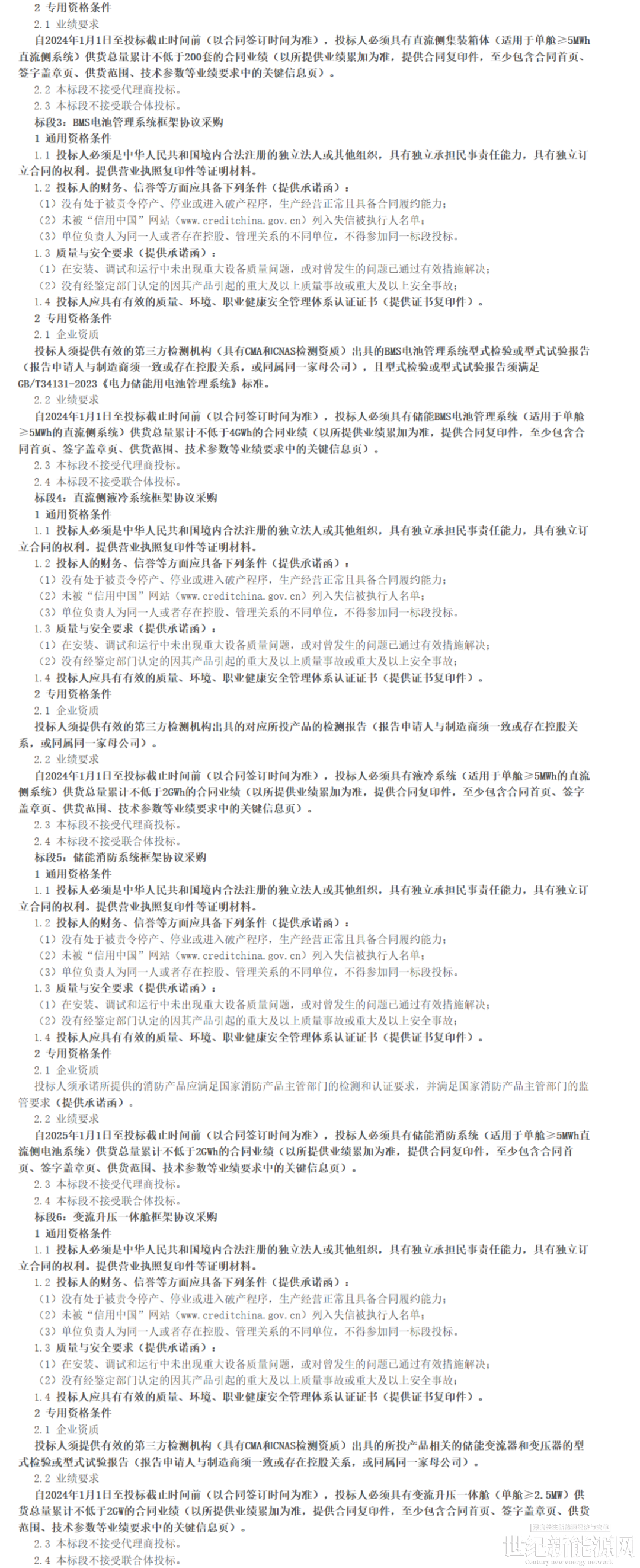 对于每个标段的投标人都有一定的业绩要求,如对于磷酸铁锂电池框架协议采购,要求投标人必须具有磷酸铁锂电池(不小于314Ah容量)供货总量累计不低于2GWh的合同业绩;对于直流侧集装箱体框架协议采购,要求投标人必须具有直流侧集装箱体(适用于单舱25MWh直流侧系统)供货总量累计不低于200套的合同业绩等。