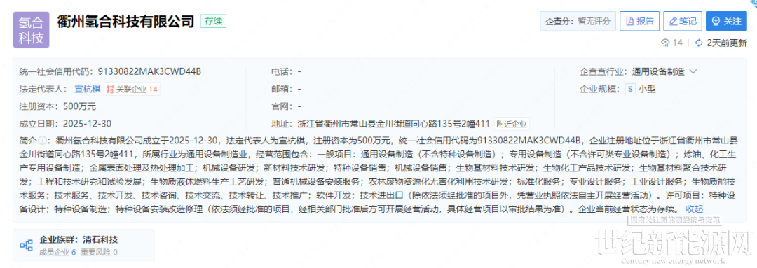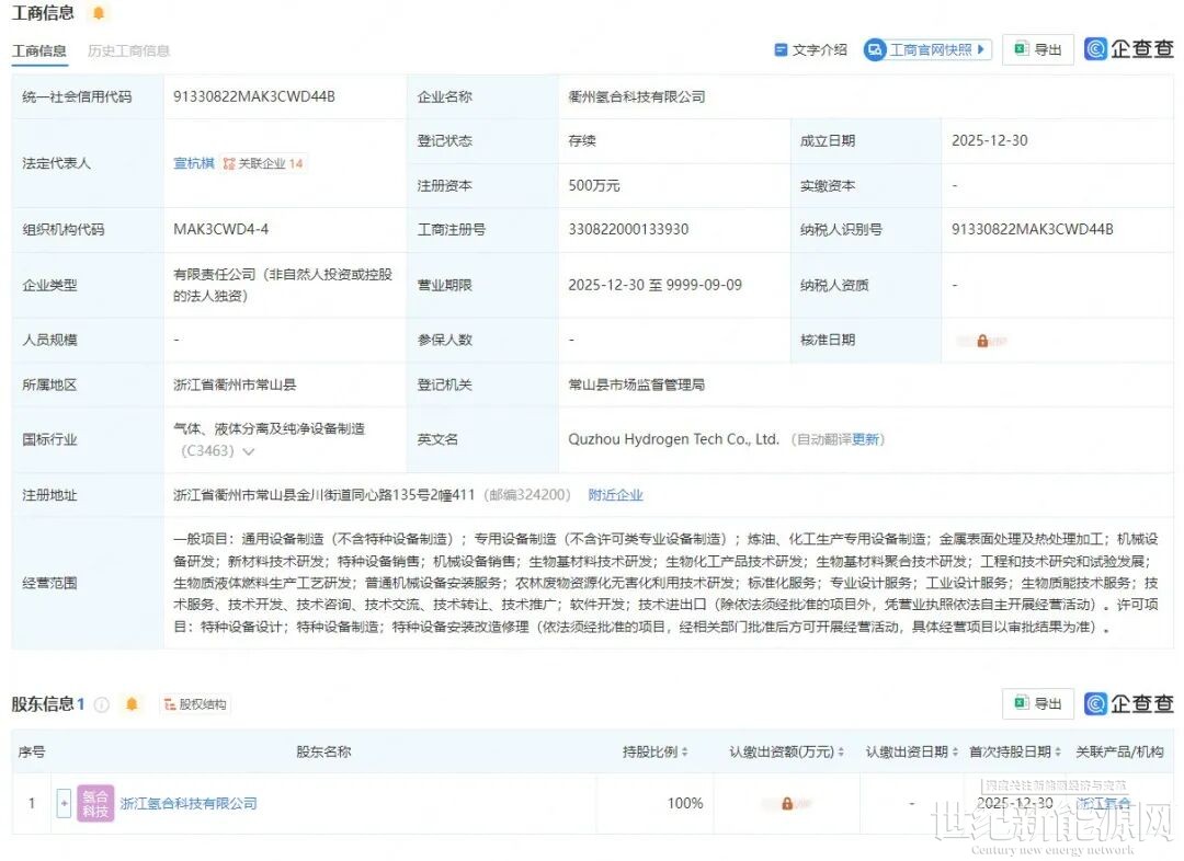 氢能观察从企查查获悉,近日,衢州氢合科技有限公司成立,注册资本500万元,法定代表人宣杭棋。