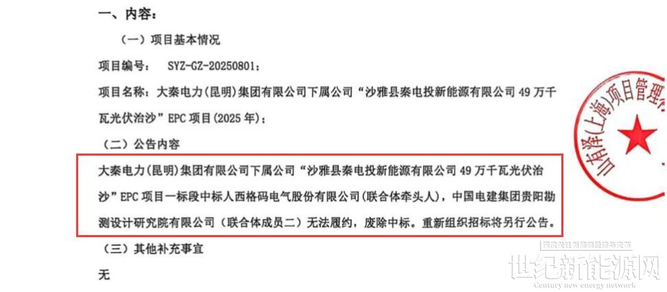 公告显示,大秦电力(昆明)集团有限公司下属公司"沙雅县秦电投新能源有限公司49万千瓦光伏治沙"EPC项目一标段中标人西格码电气股份有限公司(联合体牵头人),中国电建集团贵阳勘测设计研究院有限公司(联合体成员二)无法履约,废除中标。重新组织招标将另行公告。