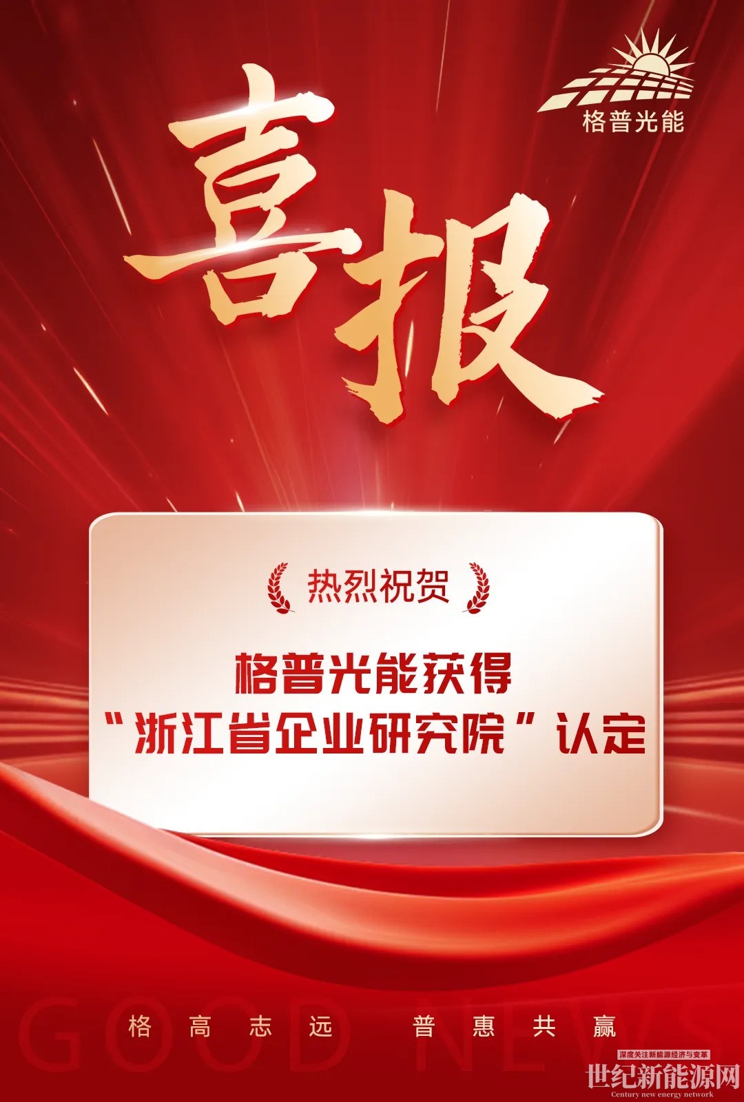近日,浙江省经济和信息化厅公布2025年度省企业研究院认定名单,格普光能申报的“浙江省格普高效光伏组件技术企业研究院”成功入选,标志着企业在光伏领域的研发创新能力获得省级权威认可,将进一步助力企业深耕技术攻关,赋能产业转型升级。
