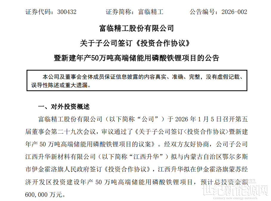 1月6日,富临精工发布公告称,子公司江西升华新材料有限公司计划在内蒙古伊金霍洛旗蒙苏经济开发区投资建设年产50万吨高端储能用磷酸铁锂项目,预计总投资60亿元。