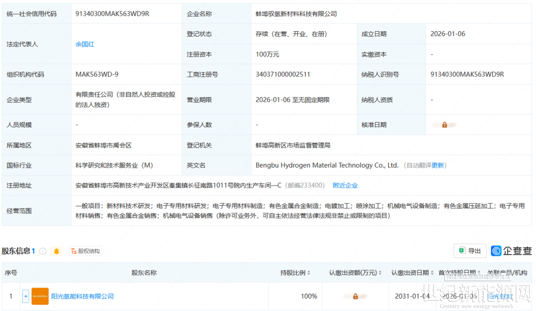 1月6日,蚌埠驭氢新材料科技有限公司成立,注册资本100万元,法定代表人余国红。