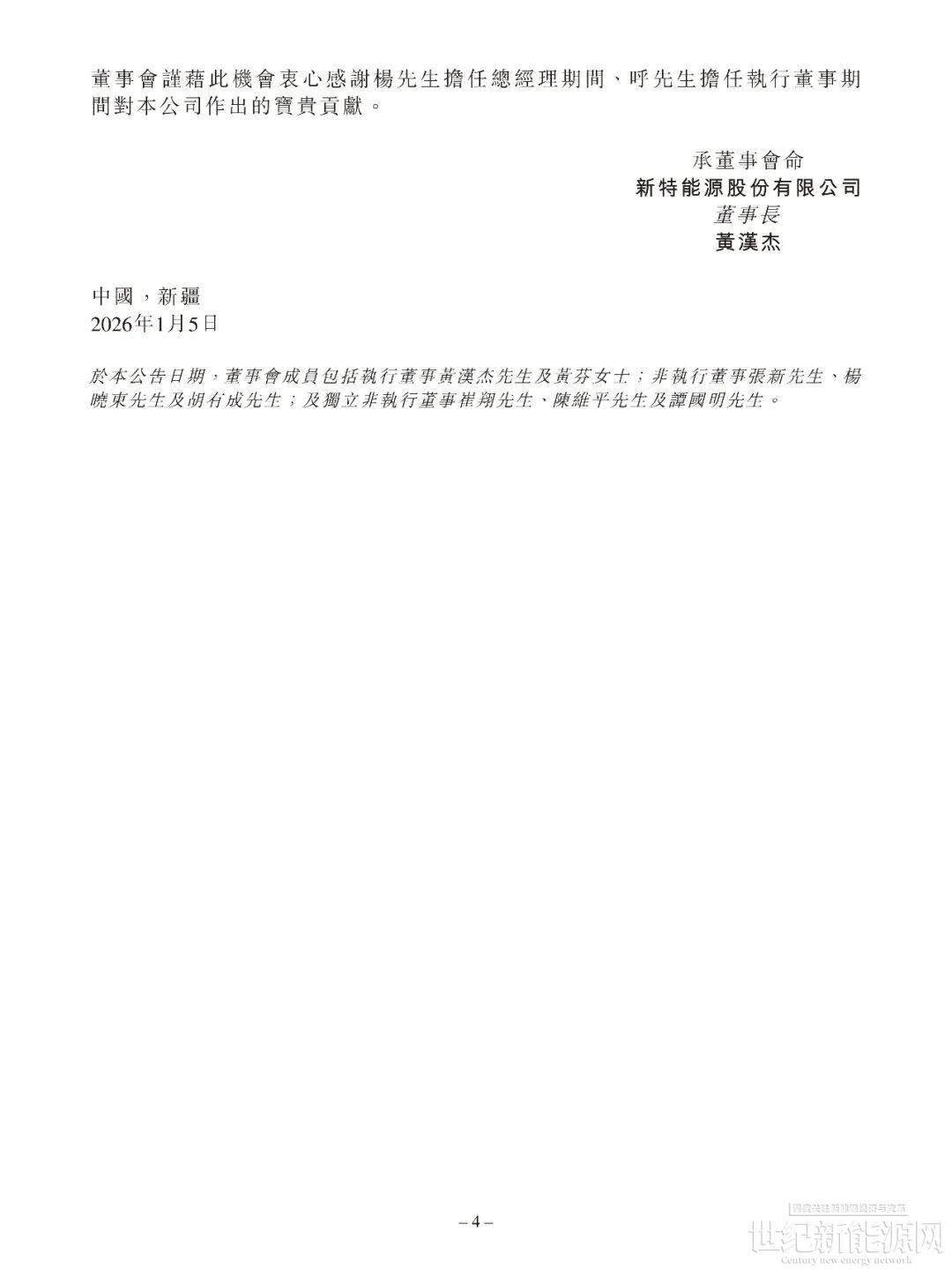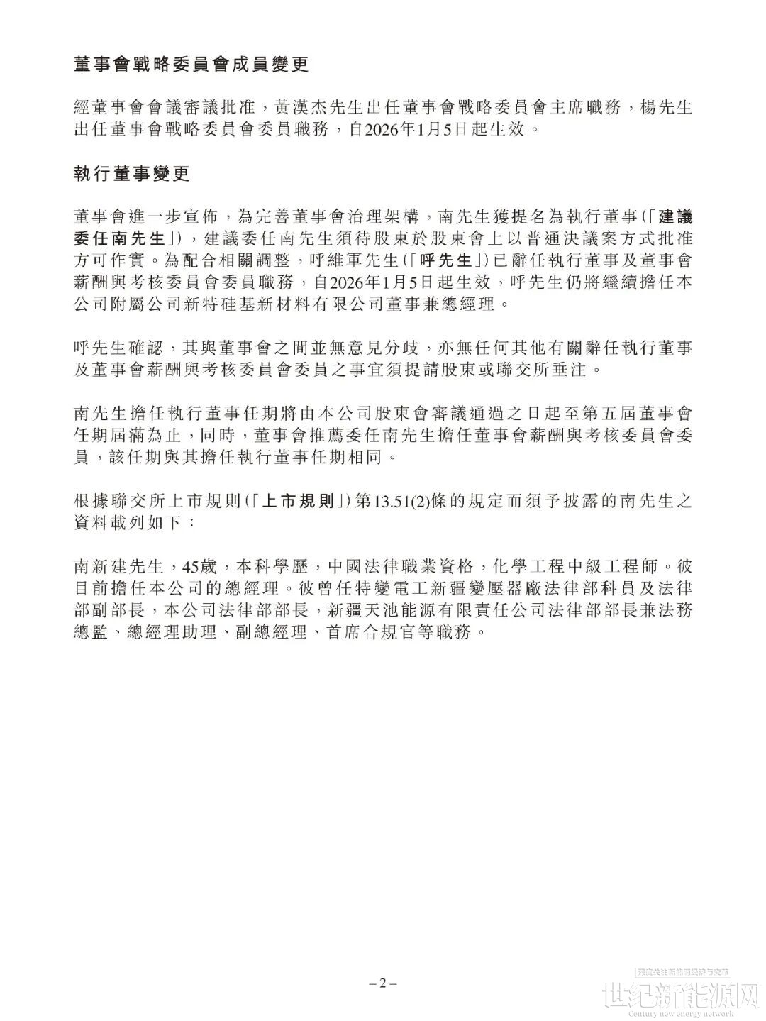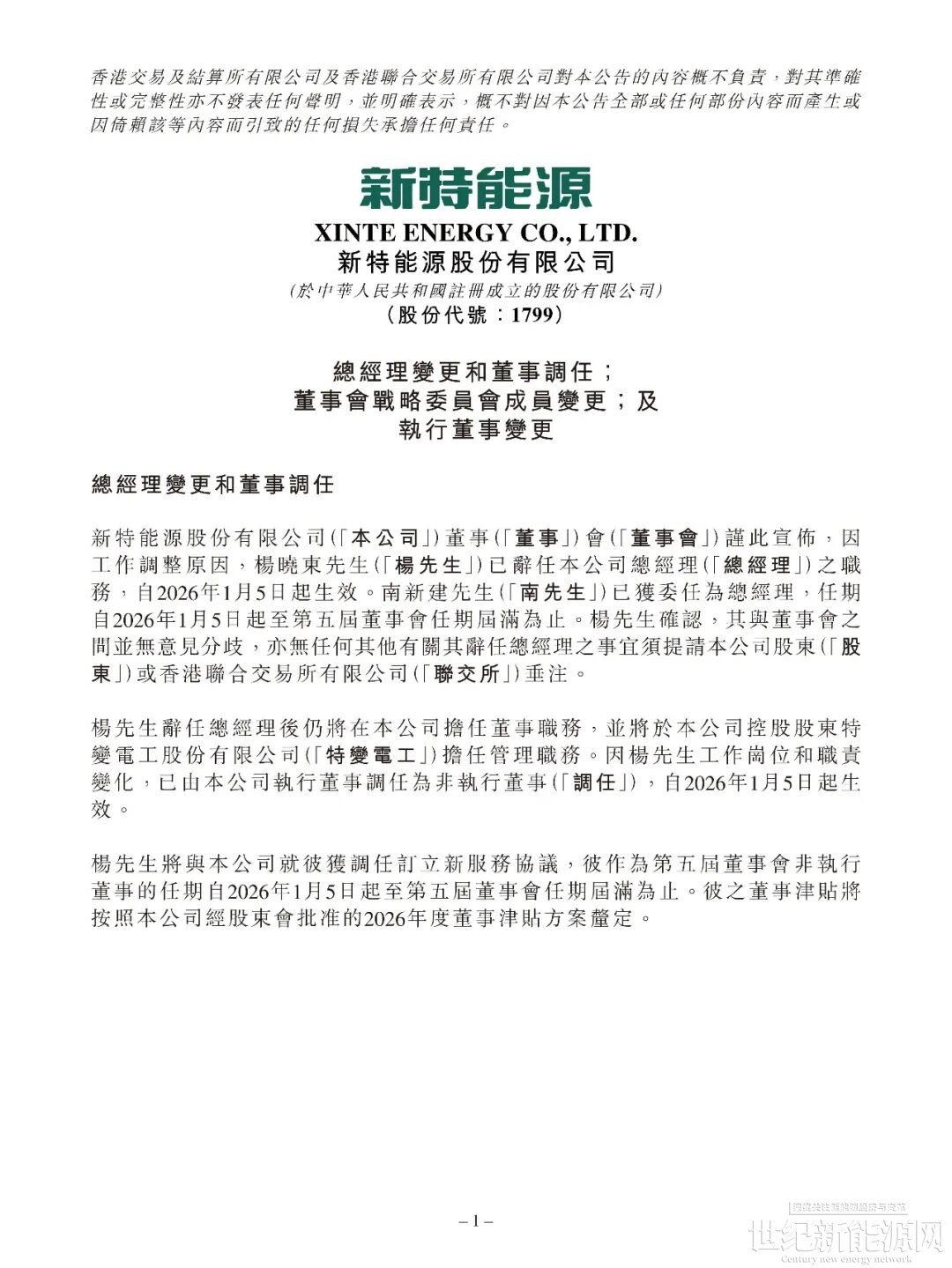 1月5日晚间,新特能源发布公告,因工作调整原因,杨晓东先生已辞任本公司总经理之职务,自2026年1月5日起生效。南新建先生已获委任为总经理,任期自2026年1月5日起至第五届董事会任期届满为止。