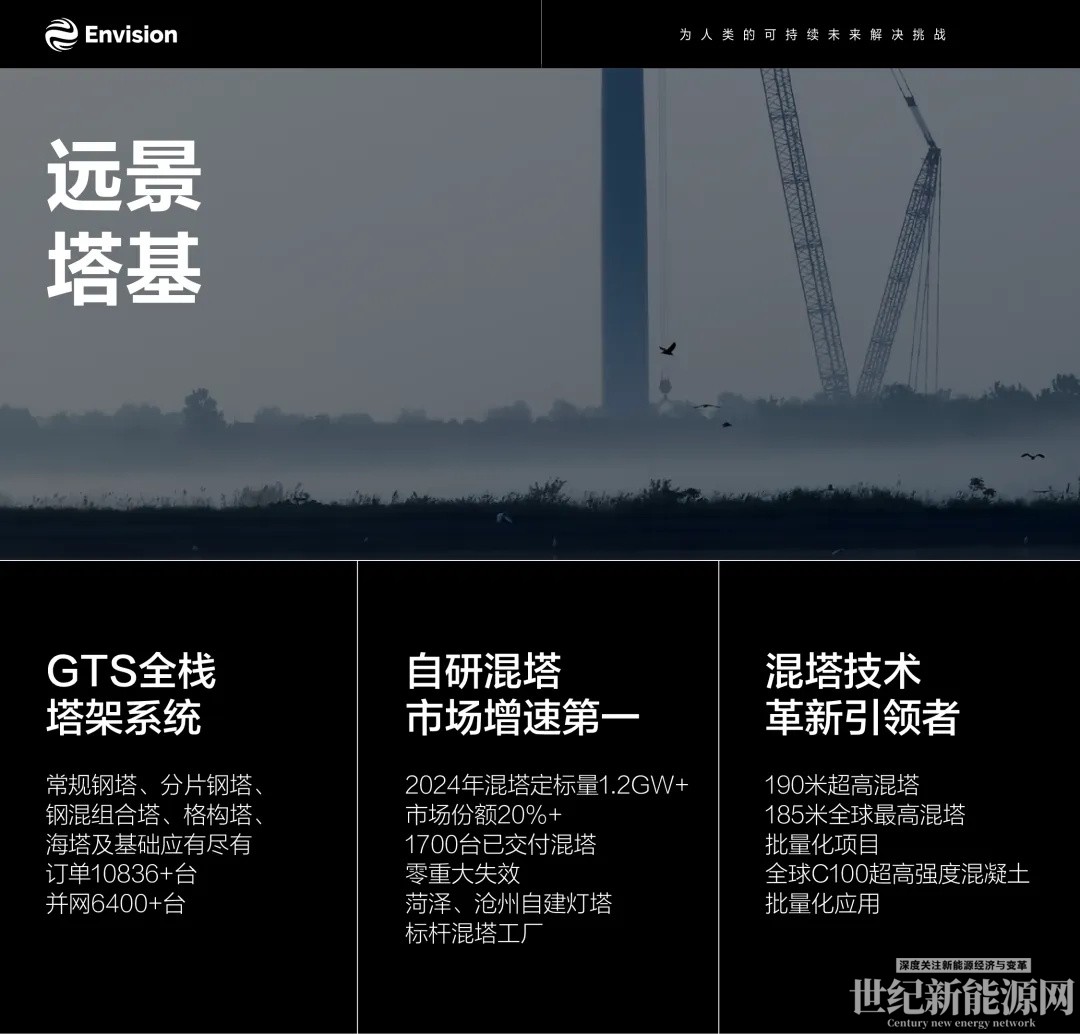 在混塔领域,2024年远景自研混塔定标量已超1.2GW,市场份额突破20%,实现市场增速第一,已交付的1700台混塔保持零重大失效。目前,远景在菏泽、沧州均自建 “灯塔工厂”,为混塔制造树立了行业标杆,形成了高效、智能、可复制的生产模式。作为混塔技术革新的引领者,远景成功打造了全球最高的190米混塔,并实现185米混塔的批量化交付;率先在全球范围内实现C100超高强度混凝土的批量化应用,不仅突破了材料和工艺的极限,也显著提升了塔架的结构性能和寿命。