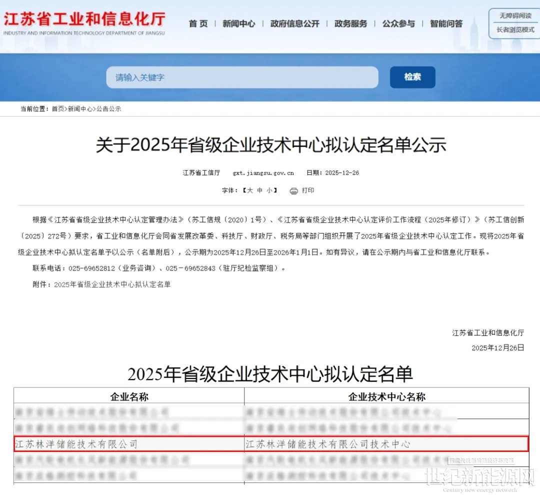 近日,江苏省工业和信息化厅正式发布2025年省级企业技术中心认定名单。林洋储能凭借在锂电池储能系统领域领先的技术实力与持续的创新成果,成功获批省级企业技术中心!