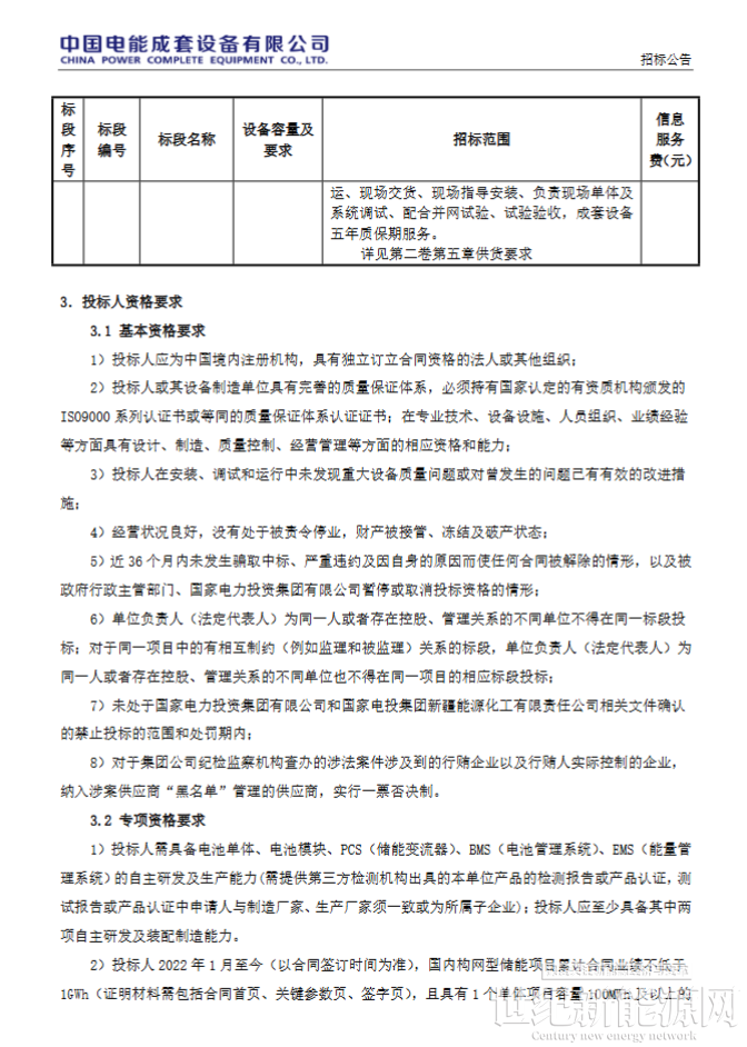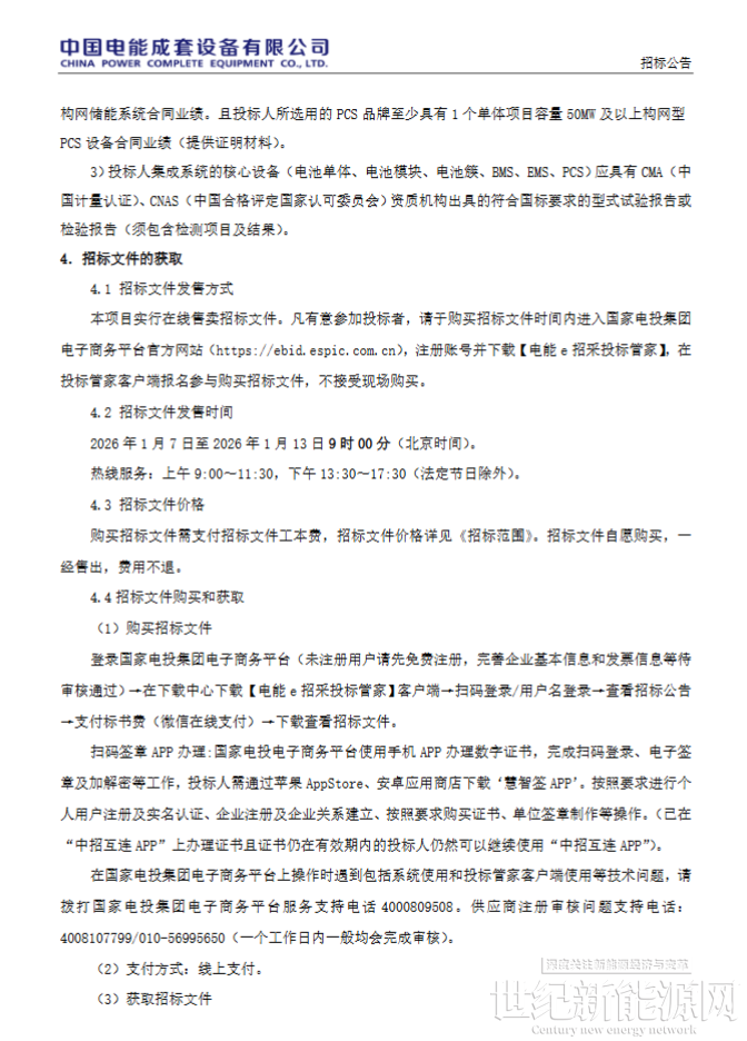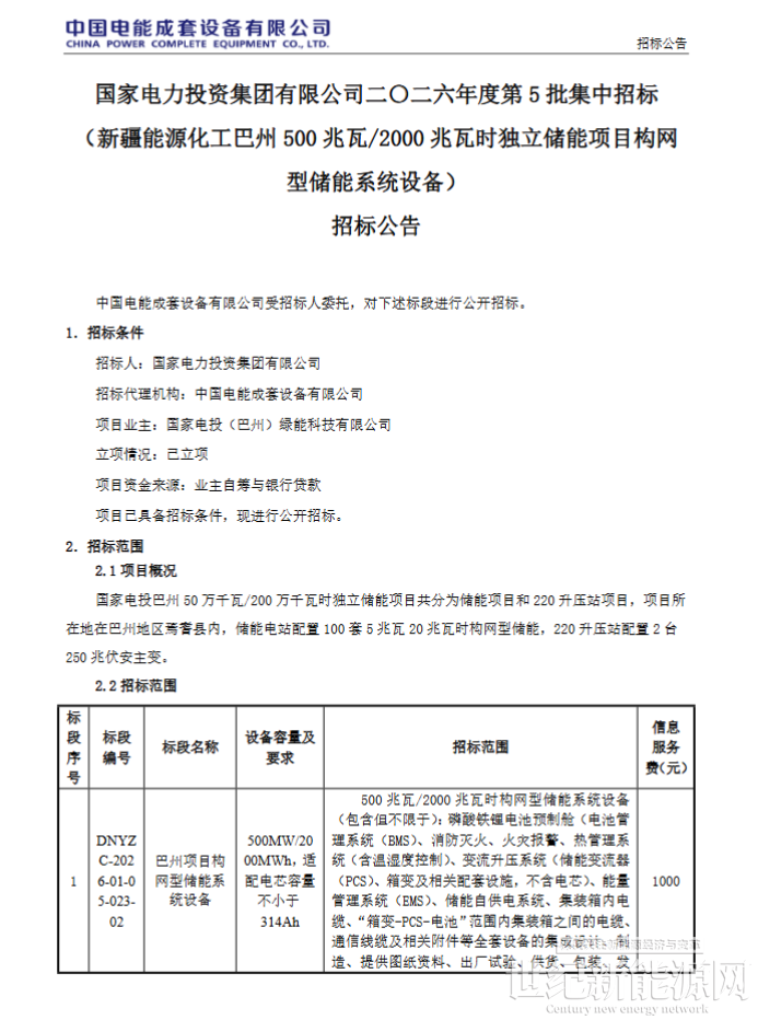 1月7日,国家电力投资集团有限公司新疆能源化工巴州500MW/2000MWh独立储能项目构网型储能系统设备招标公告发布。该项目招标人为国家电力投资集团有限公司,项目业主为国家电投(巴州)绿能科技有限公司。