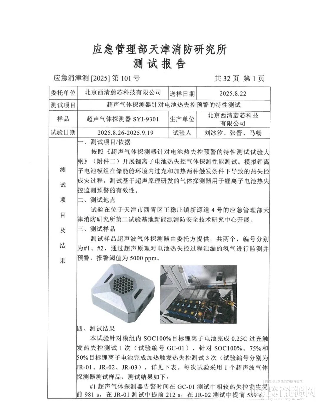 可靠性:报告显示,同一只超声气体探测器经反复热失控测试,每次均能提前正常预警,连续三次测试均保持正常工作状态,实现零误报。