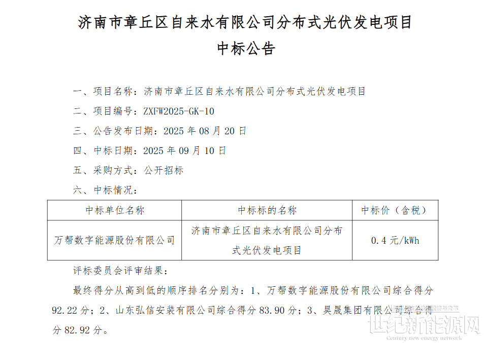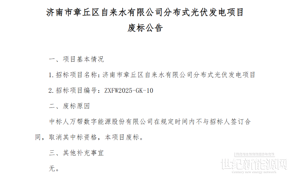 1月5日,【济南市章丘区自来水有限公司分布式光伏发电项目废标公告】发布。因中标人万帮数字能源股份有限公司在规定时间内不与招标人签订合同,取消其中标资格,本项目废标。