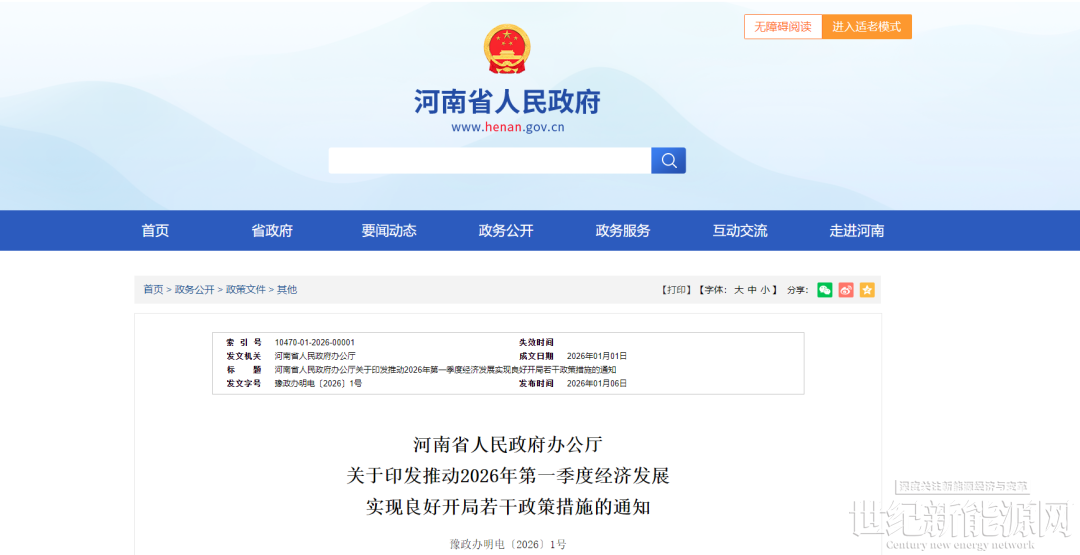 1月6日,河南省人民政府办公厅关于印发推动2026年第一季度经济发展实现良好开局若干政策措施的通知。