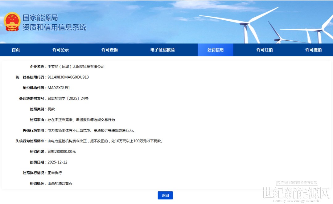 处罚信息显示,中节能旗下中节能(运城)太阳能科技有限公司、中节能(大同)太阳能科技有限公司、中节能山西潞安光伏农业科技有限公司、中节能(汾阳)光伏农业科技有限公司、中节能(阳泉)太阳能科技有限公司5家子公司,每个企业被罚款28万元,处罚事由均为存在不正当竞争、串通报价等违规交易行为。