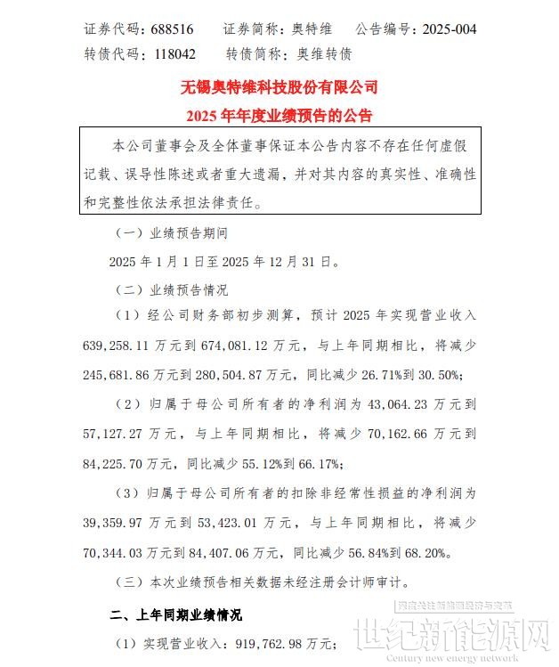 1月7日晚,光伏上市公司第一份2025年度业绩预告出炉,光伏设备制造商奥特维发布2025年年度业绩预告,表示经公司财务部初步测算,预计2025年实现营业收入639258.11万元到674081.12万元,与上年同期相比,将减少245681.86万元到280,504.87万元,同比减少26.71%到30.50%;归母净利润为43064.23万元到57127.27万元,与上年同期相比,将减少70162.66万元到84225.70万元,同比减少55.12%到66.17%。