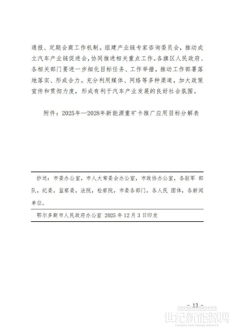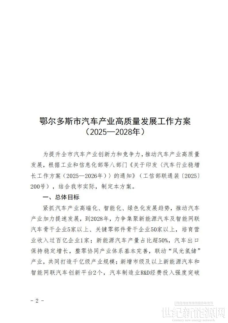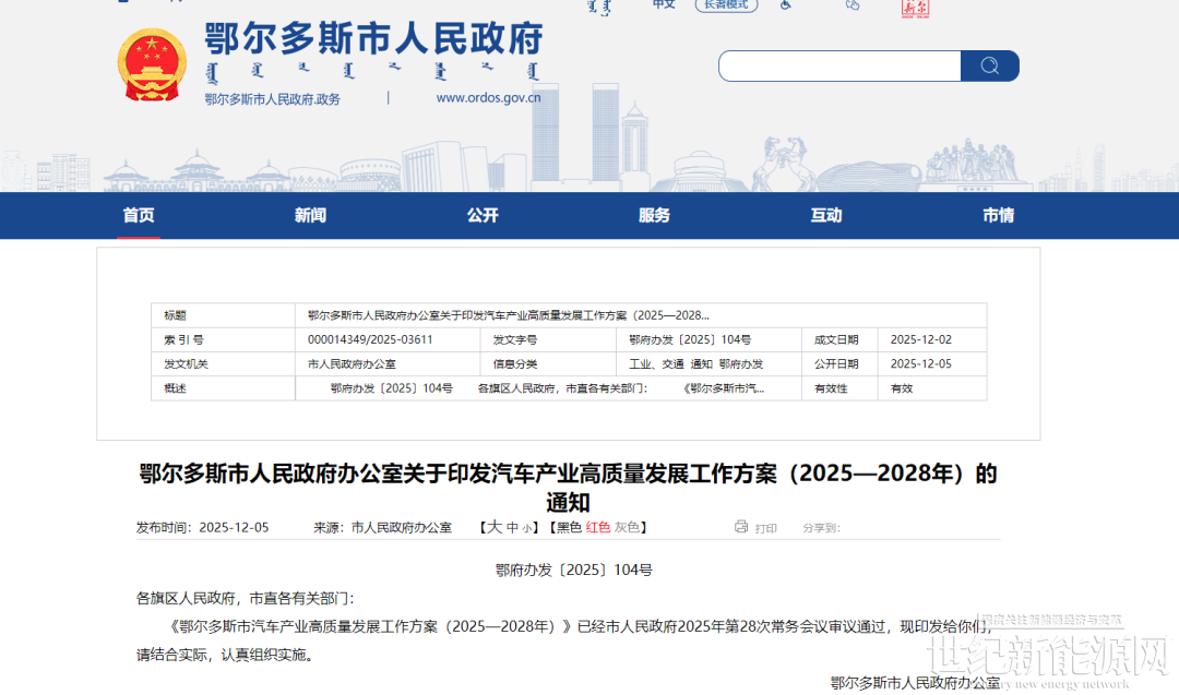 近日,鄂尔多斯市人民政府办公室关于印发汽车产业高质量发展工作方案(2025—2028年)的通知。