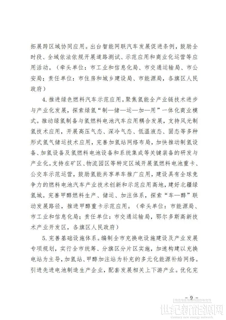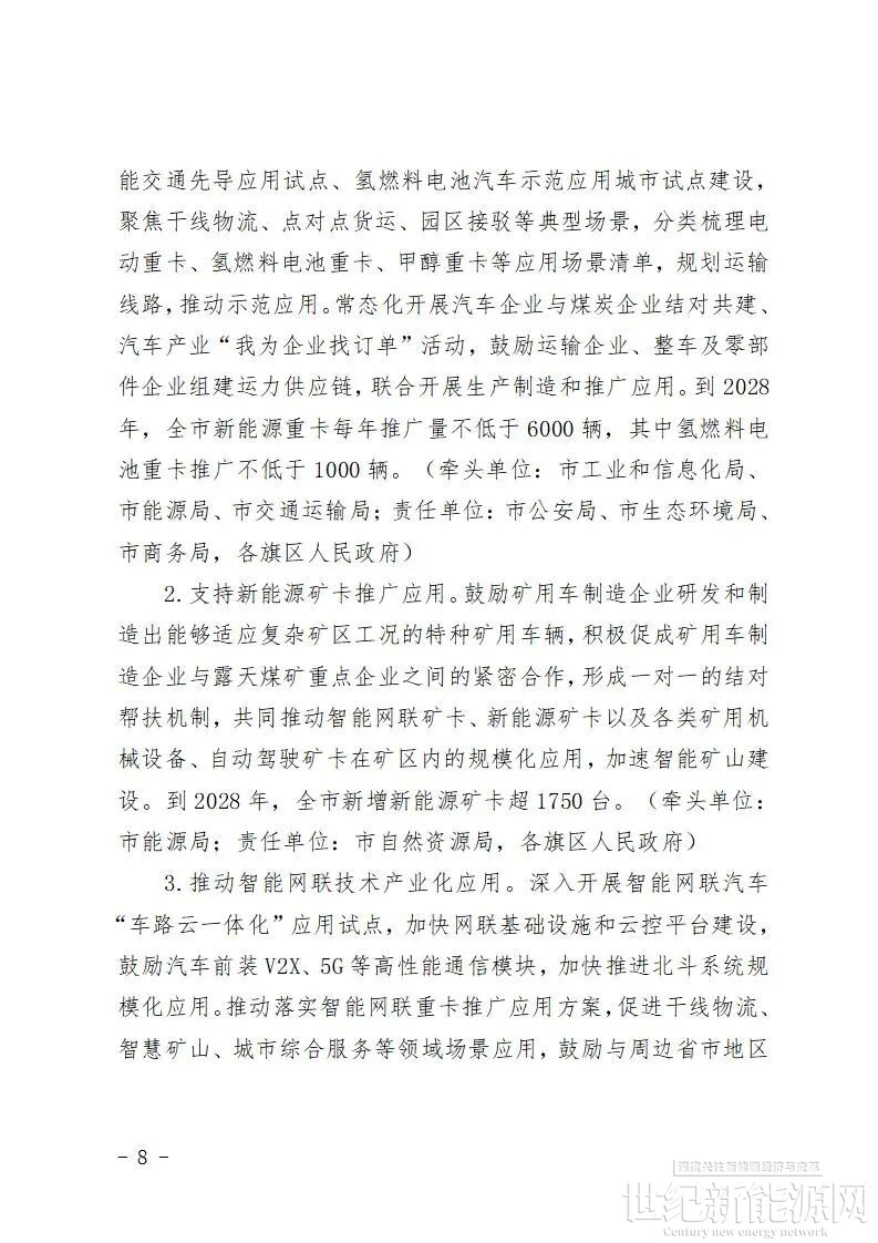 支持在矿区、物流园区等特定区域开展氢燃料电池重卡、公交车示范运营,鼓励氢能共享单车推广应用,建设具有全球竞争力的燃料电池汽车产业技术创新和示范应用高地,建好北疆绿氢城。完善甲醇燃料生产、储运、加注体系,探索“车—醇”联动发展路径,推进甲醇重卡示范应用。